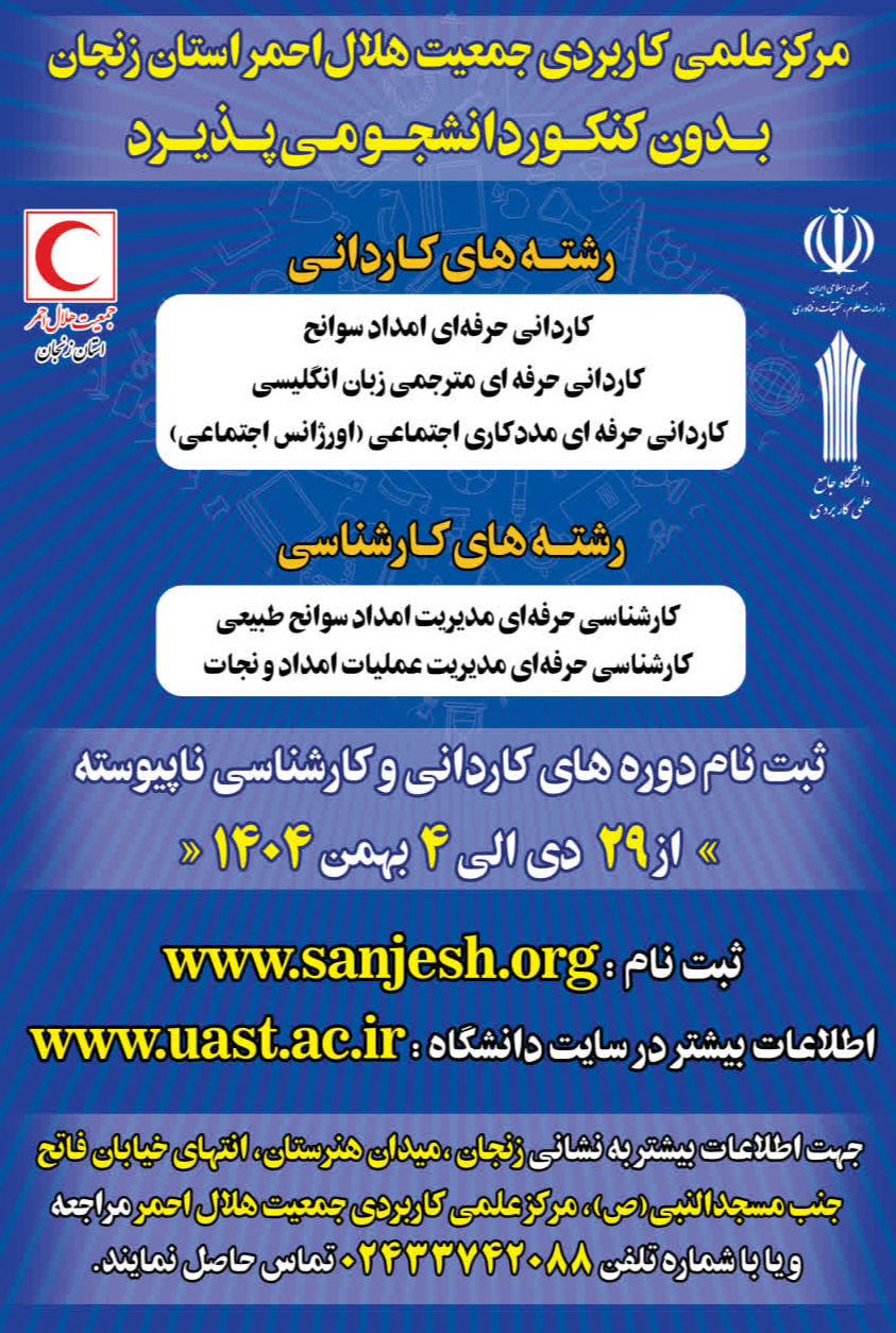 مدیرعامل جمعیت هلال‌احمر استان زنجان گفت: ثبت نام دانشجویان در مقطع کاردانی و کارشناسی در مرکز علمی‌کاربردی جمعیت هلال‌احمر استان ورودی بهمن ۱۴۰۴ آغاز شد.